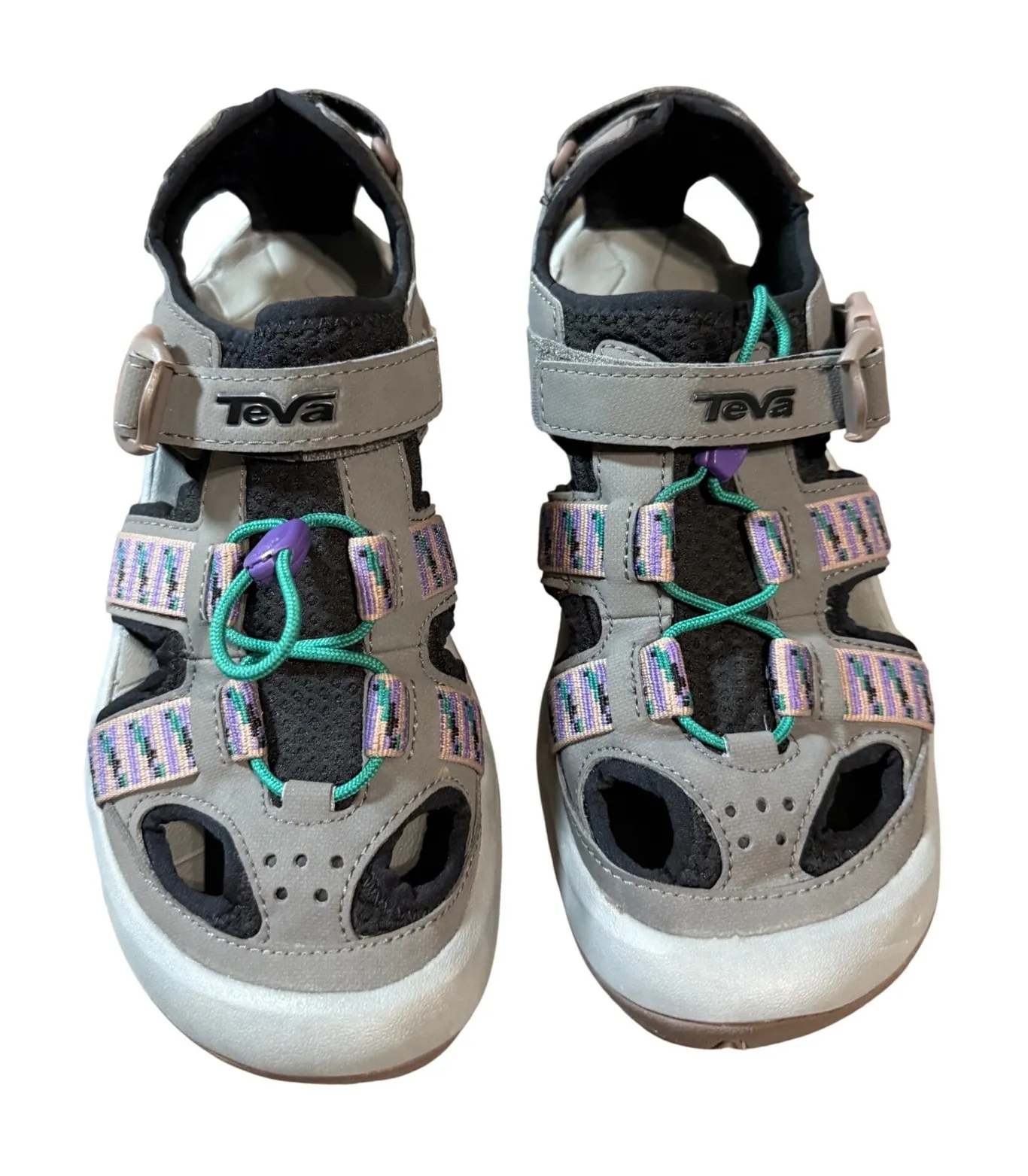 Sturdy Supportive Lightly used. Great condition. The Omnium sport sandal from Teva was designed with adventurous spirits in mind! Strap into these flat fisherman sandals and you'll be set for both water and land excursions. Item # 244546 FEATURES • Waterproof faux leather and neoprene upper • Quarter ankle and back strap with buckle and adjustable hook and loop closures • Comfort cushioned anatomic footbed with Shoc Pad™ technology • 1¼" EVA midsole • Non-marking Spider Original™ rubber sole