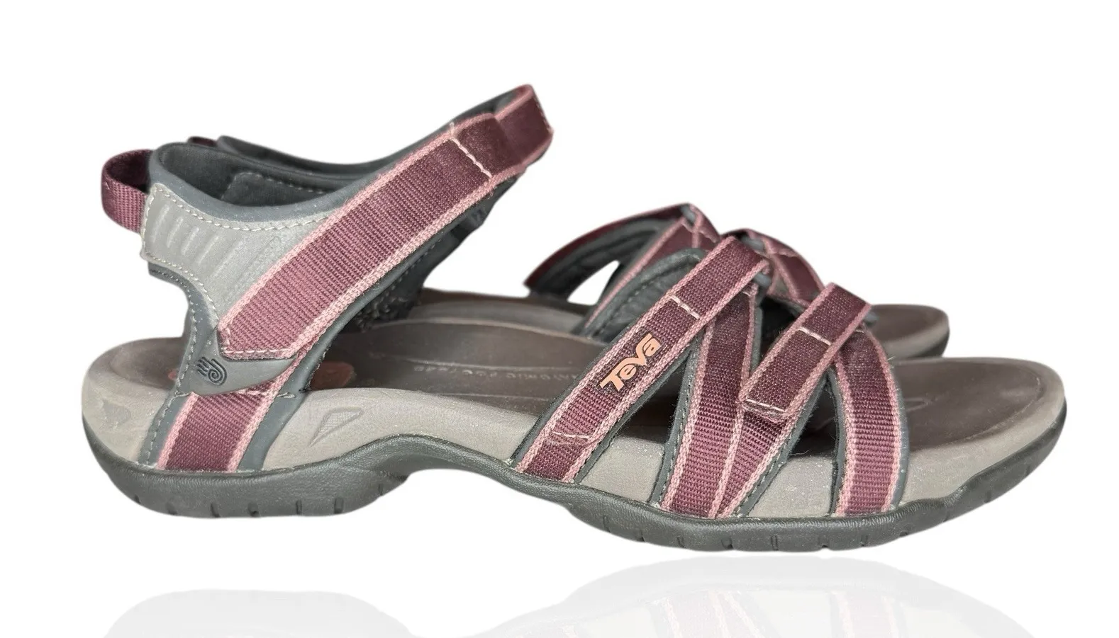 Teva Tirra women's sport hiking sandals in size 8. Designed with a supportive contoured footbed and durable rubber outsole for trail, walking, and water-friendly wear. Features adjustable hook-and-loop straps for a secure, customizable fit and quick-dry webbing in a gray and plum colorway. Lightweight yet supportive construction ideal for hiking, travel, outdoor activities, and everyday comfort. Excellent preowned condition with light, normal wear consistent with use. Ships within 24 hours. Keywords Teva Tirra sandals womens size 8 sport hiking trail water shoes gray plum adjustable strap outdoor walking comfort supportive footbed adventure travel activewear athletic summer durable rubber sole