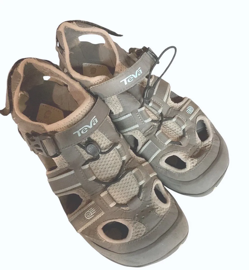 Teva Women's Omnium Strap Outdoor Hiking Sandals Slate Size 10 Some wear, pilling on inside heel. See photos. W on the label refers to women Closed-toe sandal with grosgrain webbing overlays, multiple drainage ports and quick-dry mesh lining Molded EVA foam midsole Shock-absorbing ShocPad technology in heel Bungee lacing with quick-release buckled strap at vamp and hook-and-loop backstrap Non-marking Spider Rubber outsole Synthetic upper Color: Slate