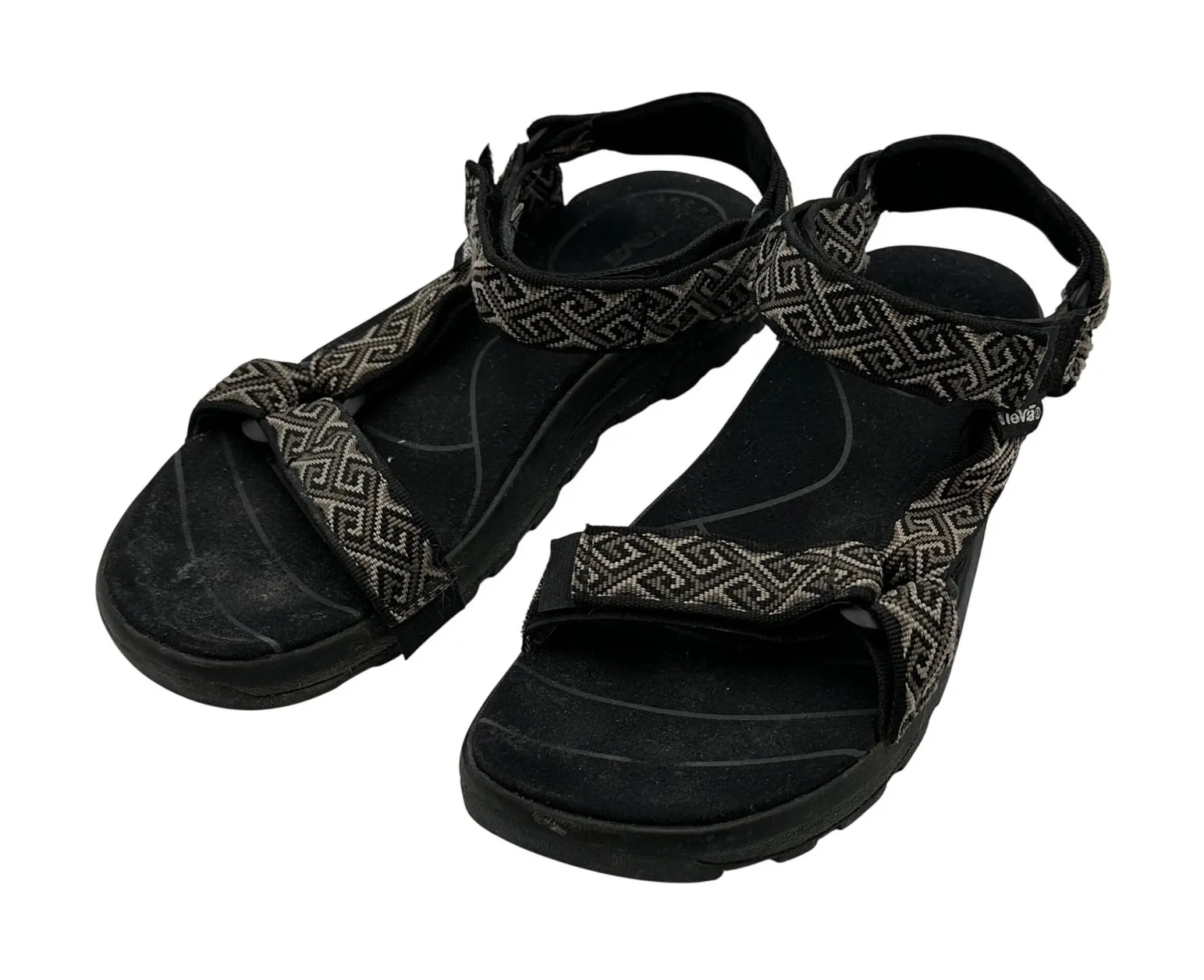 Unleash your inner explorer with these Teva sandals, where comfort meets rugged practicality! These durable sandals are ready for any adventure that awaits, from navigating rocky trails to leisurely strolls along the water's edge. Boasting adjustable straps for a custom fit and a robust sole, these shoes ensure stability and support on any terrain. The unique patterned straps add a touch of style to their utilitarian design, making them versatile enough to pair with casual outfits. Perfect for hiking expeditions, beach outings, or simply kicking back on a warm summer day. Gently used. Features: Adjustable Strap, Water Resistant, Lightweight, Comfortable, Hiking Keywords: Teva, Sandals, Women's Sandals, Hiking Sandals, Sport Sandals, Water Sandals, Black Sandals, Size 9, Adjustable Straps, Outdoor Shoes, Comfortable Sandals, Patterned Straps, Casual Sandals