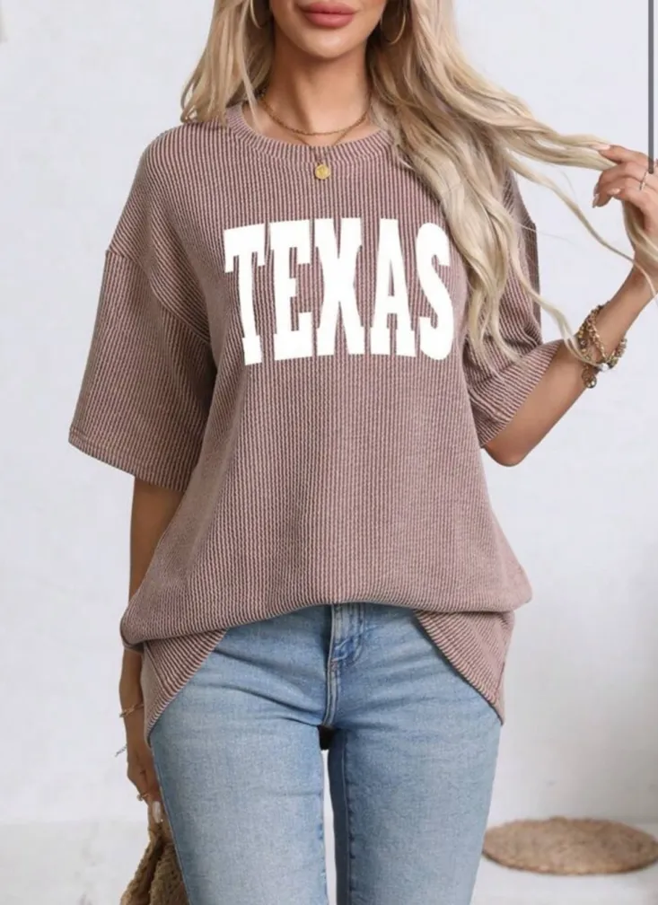 This is an unbranded women's short-sleeve t-shirt in a brown, ribbed fabric with "TEXAS" printed in white block letters across the chest. The shirt features a crew neck and a relaxed fit, with sleeves that fall to about the elbow. The hem is slightly longer in the back, creating a subtle high-low effect. The material appears to be a lightweight, textured knit. The shirt is shown in new condition, without tags.