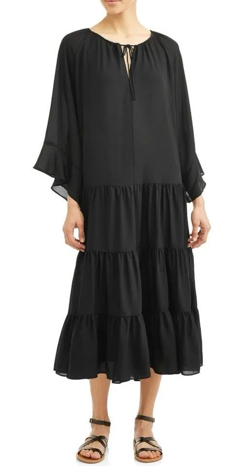 Textile Elizabeth and James ‘Candice’ tiered midi dress. Oversized. Drop waist. Ruffled bell sleeves. Ties at neck with keyhole opening. Lined. Black. Size Medium. Preowned, no flaws. Armpit to armpit: 23” Waist: 22.5” Drop waist: 21” Length: 47”