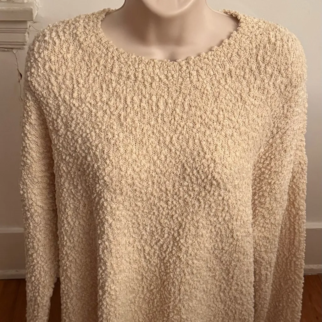 Elegant cream sweater with a textured knit. Ideal for a cozy and stylish outfit. This gorgeous sweater features long sleeves, crewneck design, super soft feeling and hi low style. 80% polyester and 20% nylon The size tag is missing - please see the measurements photos. Excellent condition We always ship the next day