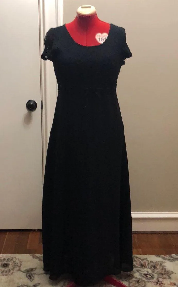 Vintage formal black dress approximately 55” from shoulder to hem. Empire waistline, long fully lined flowy A-line skirt, and cute satin ribbon. Has some pulling on top since it’s a lace that has stretch. Front is line back is see through but modest. Size shows XL but fits more like a L. Any questions please feel free to ask. Feel free to make an offer or PM for bundles. Smoke-free home.