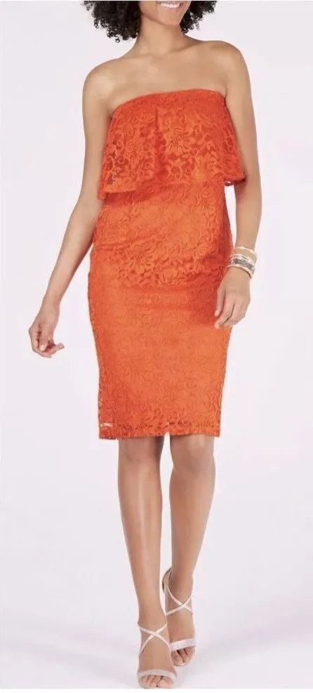 Thalia Sodi Ruffle Strapless Lace Cocktail Dress Size: Medium - see measurements in photos Color: Woodfired - Condition: New With Tags Strapless neckline with popover flounce Sheath silhouette Back zip with hook and eye closure Fully lined Thanks for looking! P Tags: coral orange red party night out formal cruise wear cruisewear