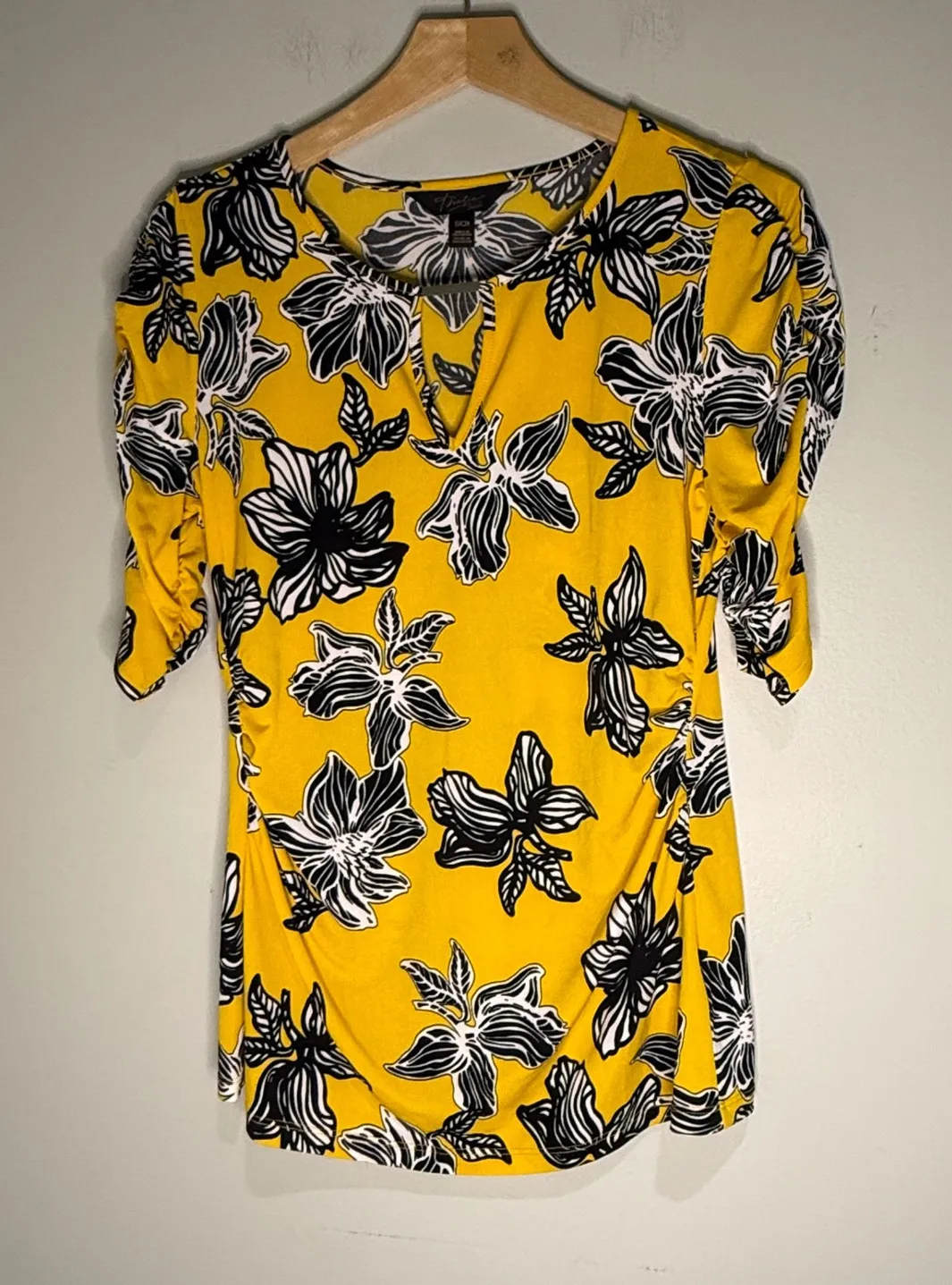 A vibrant yellow knit top adorned with a bold black and white floral print. This stylish piece features a flattering V-neckline with a subtle cutout detail and elegant ruched detailing along the side. The short, puffed sleeves add a touch of feminine charm. Perfect for a casual brunch or a lively evening out. Measurements: • Across: 18 in • Length: 26 in Type: Blouse Department: Women Style: Tunic Neckline: V-Neck Sleeve Length: Short Sleeve Sleeve Type: Puff Sleeve Pattern: Floral Theme: Tropical Features: Stretch Fit: Slim Fabric Type: Jersey Occasion: Casual, Party/Cocktail Closure: Pullover Season: Summer, Spring, Fall Unit Type: Unit Keywords: Thalia Sodi, knit top, yellow top, floral print, ruched side, puffed sleeves, V-neck, casual wear, daytime outfit, summer fashion, spring style, bold print, statement top