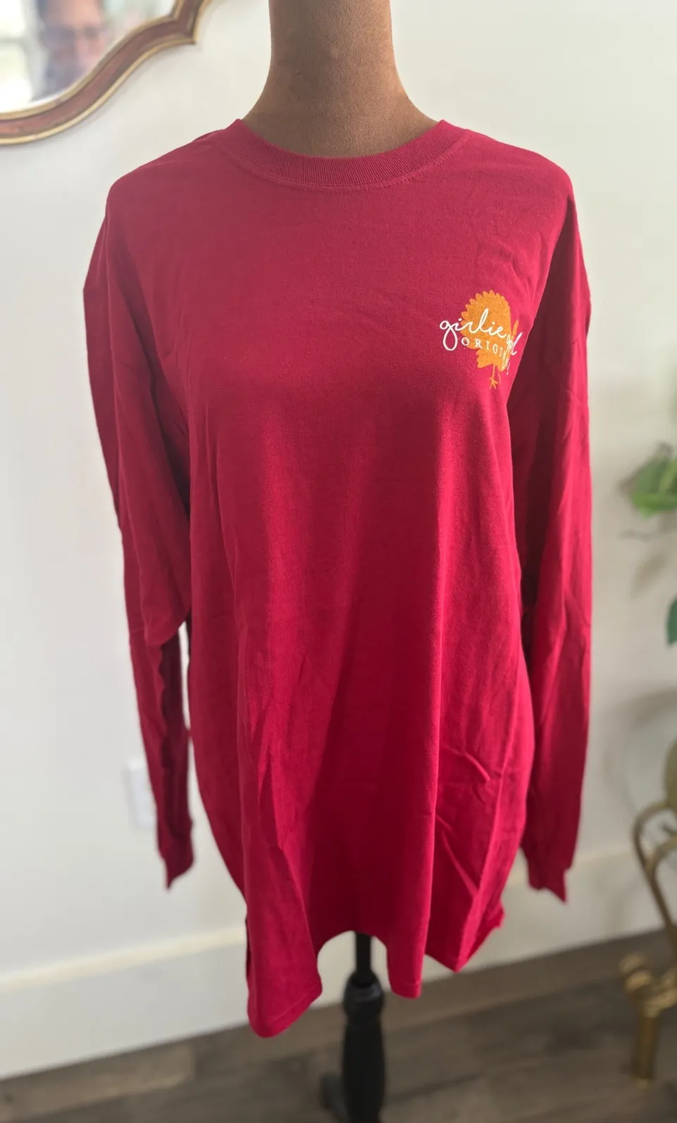 Keywords: Thanksgiving shirt, long sleeve tee, turkey graphic, fall fashion, holiday apparel, women's t-shirt, grateful thankful stuffed, Gildan, Large, casual wear, red shirt, seasonal clothing, autumn outfit
