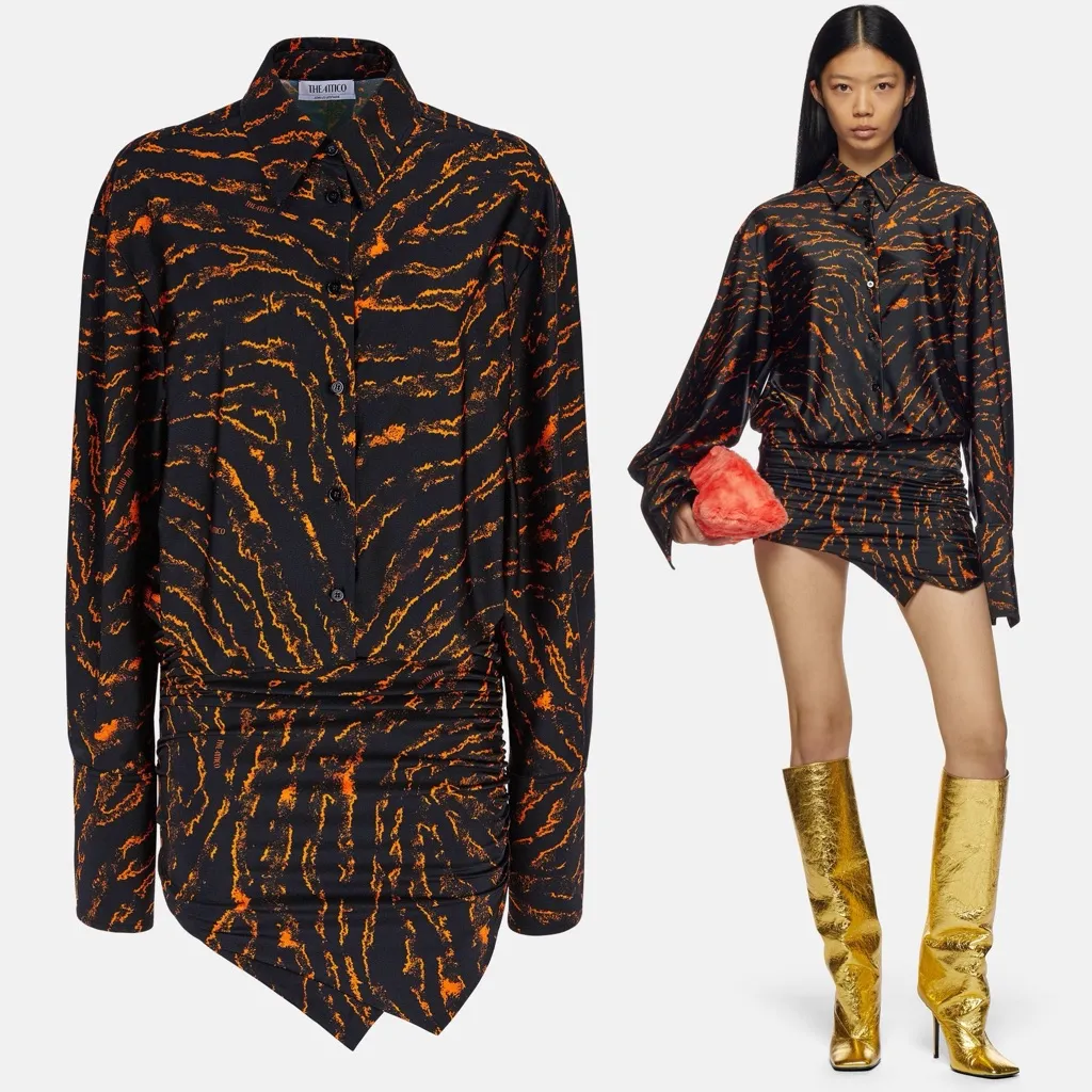 So cute 🖤 Brand new without tags! Size IT 40 / US 2-4 / small (runs big- see measurements below). Features: A bold statement piece from The Attico, the “Hatty” mini dress features a striking black and cinnamon tiger print on luxurious stretch lycra. Designed with a sharp collared neckline, button-front closure, and long sleeves, this Italian-made dress is elevated by a ruched waistline and asymmetrical draped hem for a sculpted silhouette. Both edgy and refined, this sold-out runway favorite is the perfect choice for nights out or high-fashion events. - Material: Main fabric 80% nylon, 20% elastane; lining 84% nylon, 16% elastane Approx. Measurements (un-stretched): - Bust: 40 inch - Waist: 38 inch - Hip: 32 inch - Length: 30 - 39 inch - Sleeve: 24 inch Style Aesthetic: runway glamour, luxury nightlife, new money chic, statement dressing, fashion-forward, influencer style, party-ready, modern edge, Italian luxury, bold femininity, after-dark elegance, high fashion