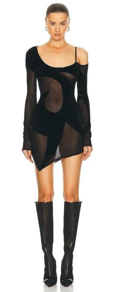 The Attico sheer asymmetric minidress The Attico's sheer minidress is cut to a wide neckline with one bare shoulder before falling to an asymmetric hem. Pull-on styling Singular spaghetti strap styling Sheer mesh and flocked jersey fabric panels Asymmetric hem Unlined Hand wash 38% cotton, 34% nylon, 28% viscose Made in Italy Our Style No. ATTF-WD207 Manufacturer Style No. 241WCA284 - KC067 - 100 Color: Black MSRP: $1,250.00 Features: • Totally Sold out on FWRD! Size: Womens 42 Measurements taken flat across, very stretchy Bust 16 in Hips 16 in Length 33.5 in Waist 14 in Condition: New With Tags With FWRD partial tag Tags: night out, party, event, date night, sexy, bodycon, graduation, mini, cocktail, going out, bright colorful, fancy, wedding guest, sheath, brunch, bachelorette, simone, rush, sorority, designer, luxury, high end, runway, knit, sheer, mesh, sweater, knit