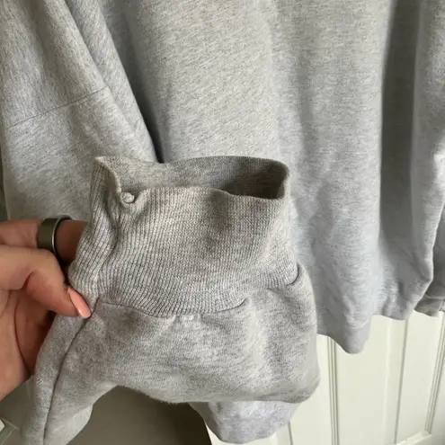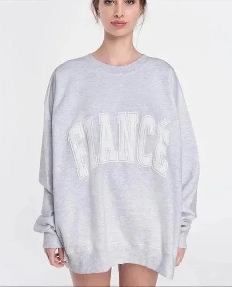 Used Fiancé sweatshirt. Ash Gray. White lettering FIT & SIZE Oversized boyfriend fit Drop shoulder sleeve Recommend sizing up to maintain an oversized fit Mia is 5'9 and takes an XL sweatshirt FABRICATION 90% Cotton / 10% Polyester Imported. Silk screen printed and finished in NYC CARE INSTRUCTIONS Turn garment inside out. Machine wash cold. Do not bleach. Tumble dry low or air dry to avoid shrinking Our Varsity Sweatshirts are a cotton blend and may shrink up to a full size after first wash Our Varsity Sweatshirts are designed to have a vintage, lived-in look and may crack or fade over time