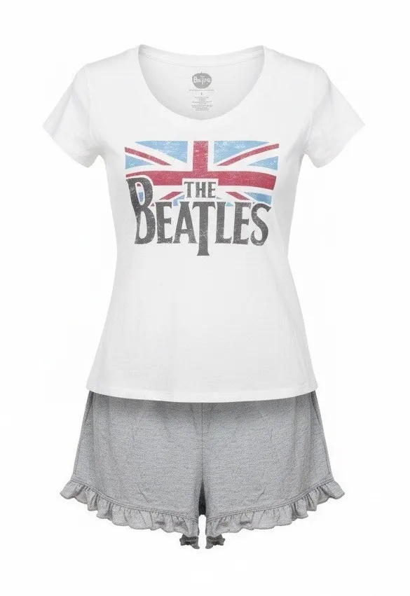 Rock out in iconic style with this The Beatles pajama set. The crisp white t-shirt features a bold graphic of the Union Jack flag overlaid with the legendary band's name, offering a touch of British rock-and-roll flair. Complementing the tee are soft grey lounge shorts adorned with a playful ruffled hem, promising ultimate comfort for a relaxed evening or a cozy morning. Perfect for lounging at home, enjoying a music festival, or gifting to a fellow Beatles enthusiast. Type: Pajama Set Department: Women Theme: Music, Flag Pattern: Graphic Print Material: Polyester, Rayon Fabric Type: Rayon Sleeve Length: Short Sleeve Closure: Drawstring Season: Summer Accents: Ruffle, Logo Neckline: V-Neck Garment Care: Machine Washable Country of Origin: China Unit Type: Unit Keywords: Beatles, pajama set, lounge wear, graphic tee, shorts, ruffle trim, music fan, band merch, sleepwear, casual, comfortable, iconic, British flag