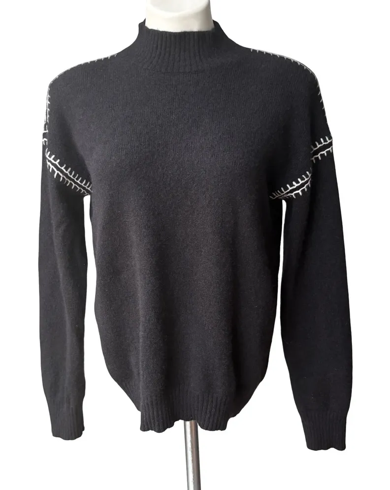 The Cashmere Project Black Mock Neck Cashmere Sweater w/White Stitch Trim. 100% cashmere. Size:... Show more