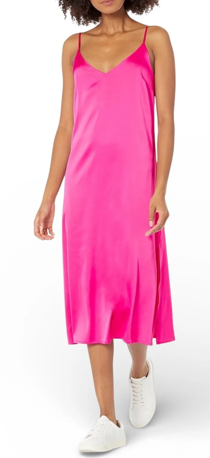 Radiate confidence in this vibrant hot pink slip dress. The luxurious satin fabric cascades beautifully, creating a flattering silhouette that moves with you. Adjustable spaghetti straps ensure a perfect fit, while the classic V-neckline adds a touch of allure. The midi length and subtle side slit offer a sophisticated yet playful charm. Perfect for a chic night out, a stylish brunch, or a glamorous vacation evening. Style: Slip Dress, Sundress Dress Length: Midi Department: Women Sleeve Length: Sleeveless Pattern: Solid Occasion: Casual, Party/Cocktail Material: Polyester Fabric Type: Satin Theme: Designer Neckline: V-Neck Season: Summer, Spring Sleeve Type: Strappy Sleeve Closure: Pullover Accents: Strap Features: Side Slit Keywords: slip dress, satin dress, hot pink dress, midi dress, v neck dress, spaghetti strap dress, evening dress, cocktail dress, party dress, summer dress, date night dress, resort wear, fashion dress