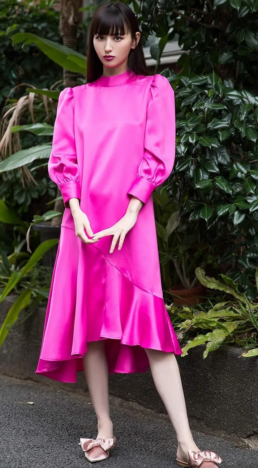 A vibrant and stylish midi dress from enisuzuki The Drop. This eye-catching piece features a sophisticated mock neck and elegant 3/4 puff sleeves, adding a touch of drama. The dress is designed with a flattering silhouette and a unique asymmetrical hemline, creating a modern and chic look. A keyhole back adds a subtle detail. Gently used in excellent condition Approximately measurements Chest 20" Waist 19" Length 43" Keywords: enisuzuki The Drop, pink dress, midi dress, mock neck dress, puff sleeve dress, party dress, cocktail dress, satin dress, womens dress, size S, magenta dress, special occasion dress, formal dress, asymmetrical hem dress
