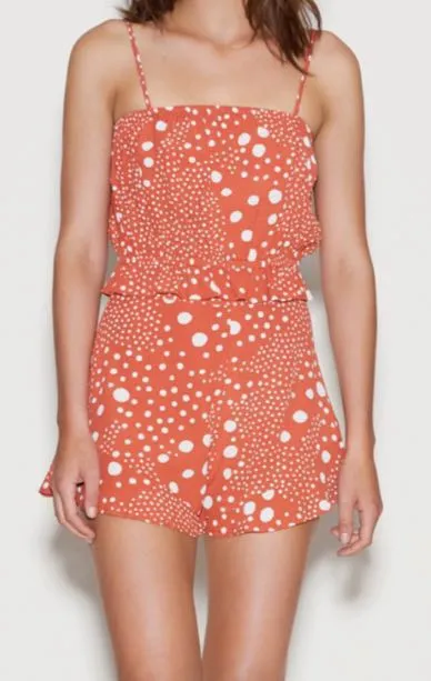 Burnt orange/rust with white polka dot pattern, top has adjustable spaghetti straps and elastic on top and bottom, shorts are zipped in the back and have a slight ruffle at bottom. Worn once Top is small and bottoms are medium but run small