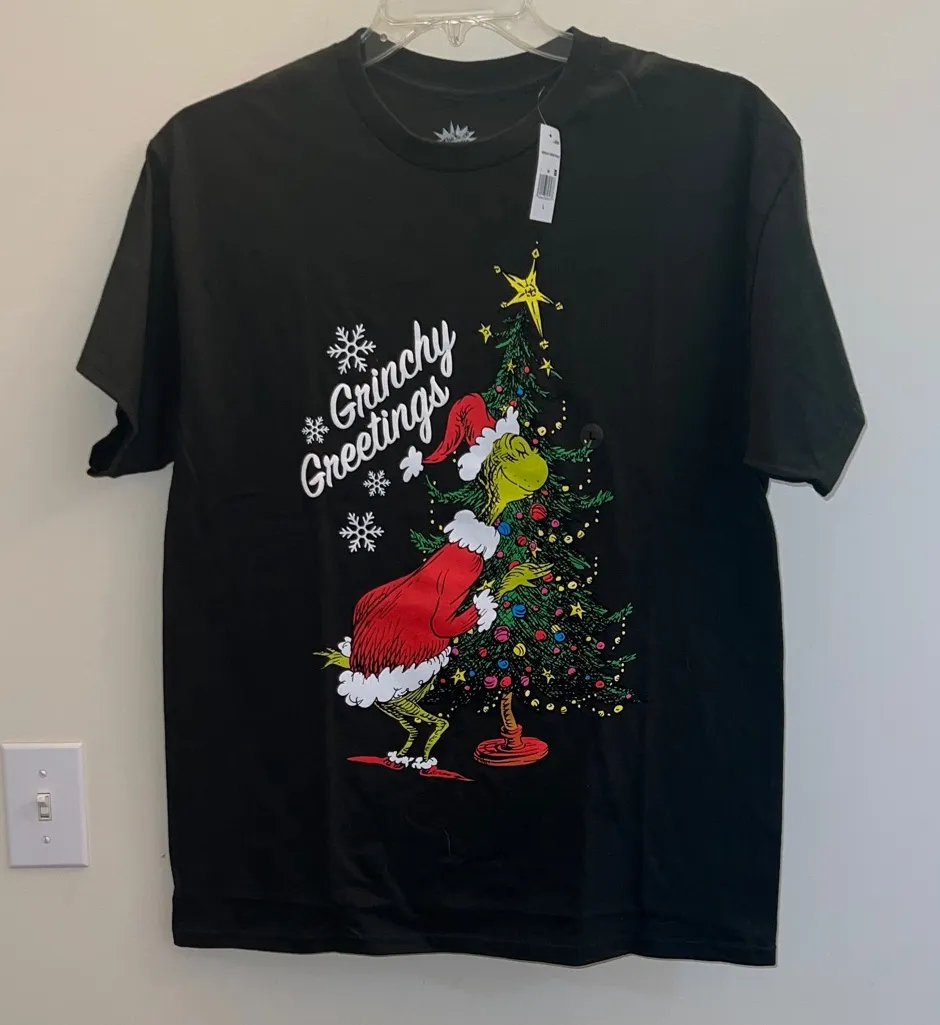 . Bring some festive Grinch energy to your holiday season with this officially licensed Grinch graphic tee! Featuring the Grinch decorating a Christmas tree with bright holiday colors, this fun and cozy shirt is perfect for Christmas parties, family photos, lounging, or gifting. ✨ Condition: New With Tag (NWT) ✨ Size: Large (L) ✨ Color: Dark Green / Black (deep charcoal-green tone) ✨ Brand: Hybrid Apparel – Official Dr. Seuss Licensed ✨ Material: 100% Cotton 📌 Features: • Vibrant Grinch holiday graphic • Soft and comfortable fabric • Classic crew neck tee • Great for festive outfits and holiday events • Officially licensed Dr. Seuss merchandise Pit to pit approx. 21” Length approx. 28”