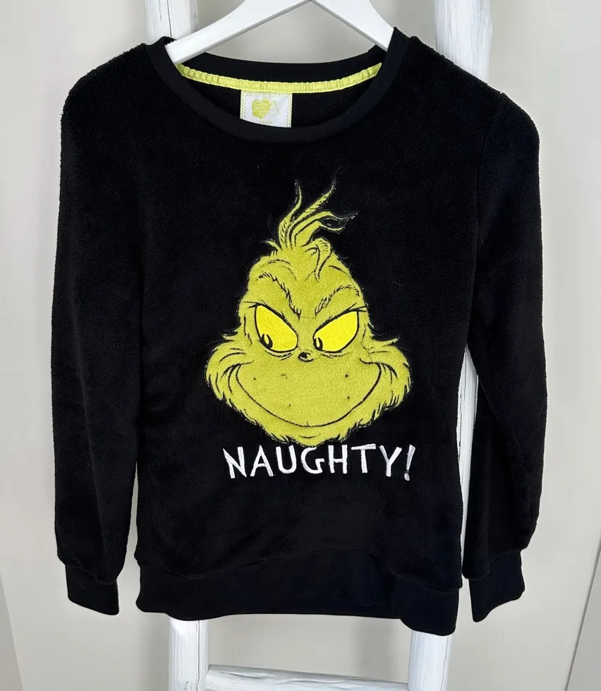 This cozy black sweatshirt features a playful Grinch design with the word 'Naughty' on the front. Perfect for adding a touch of fun to your holiday wardrobe. •polyester. Fuzzy and soft •size xsmall •approx pit to pit 18”, length 25” •preloved condition