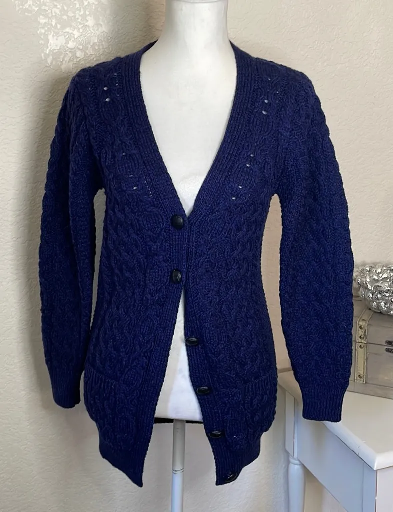 The Irish Store Ladies wool sweater Sz small. Thick and cozy knit in dark blue with a touch of black. Two front patch pockets. In excellent preowned condition See photos for measurements Never go out of style! Classic and excellent quality. Questions? Leave a comment below!