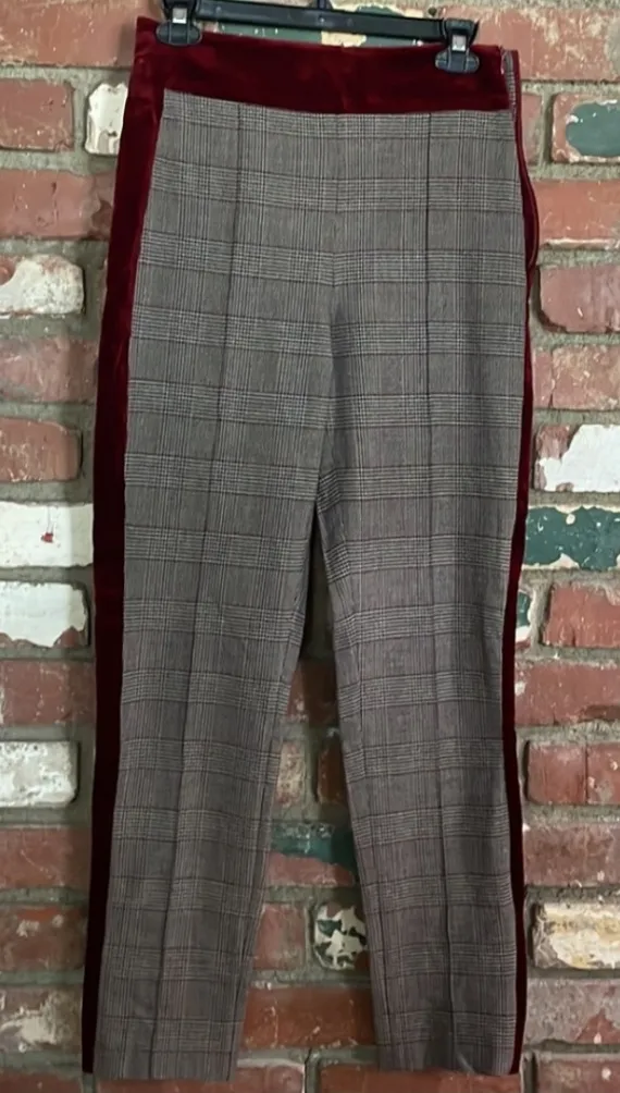 From The Kooples of Paris come these trouser pants from their vintage Prince de Galles line in beige maroon and black plaid. Just in time for all the holiday celebrations. Features velvet tuxedo band around waist and down legs. Side hidden zipper closure, sleek flattering design. Elasticized in back for comfort. Stitched pleated detail front