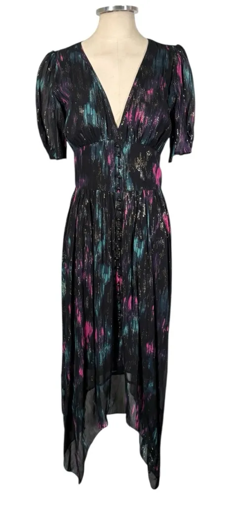 Like newThe Kooples Metallic Printed Short Sleeve V neck Midi Dress Size 2 US 6 Features: Metallic lightweight fabric in multicolor and black. Short Puff sleeves. Faux button front detail. Fitted waist. Draping bottom hemline. V neck. Midi Length. Zip closure Approximate flat lay measurements *16" pit to pit *13" Empire waist line *17" hips *43" shortest to 54" longest length D698 Style tags: party, wedding, date, night out, special occasion, special event