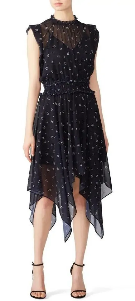An effortlessly chic and stylish dress for women. Featuring a sophisticated floral pattern in white and red on a black background, this sleeveless dress has a flattering mock neckline with delicate ruffle trim and a partially open back with string detail. The cinched, elasticized waist creates a defined silhouette, while the handkerchief hem adds a touch of bohemian flair and flowy texture. Perfect for garden parties, summer events, or a night out, this dress is sure to turn heads. Style: Mini, A-Line Dress Length: Short Color: Black Department: Women Sleeve Length: Sleeveless Pattern: Floral Occasion: Party/Cocktail, Casual Material: Chiffon Neckline: Mock Neck Character: Bohemian, Chic, Stylish, Flowy, Party Girl Fabric Type: Chiffon Season: Spring, Summer Sleeve Type: Cap Sleeve Closure: Tie Keywords: THE KOOPLES dress, floral dress, black dress, sleeveless dress, handkerchief hem dress, mini dress, boho dress, party dress, summer dress, designer dress, cinched waist dress, ruffle trim dress, mock neck dress, cocktail dress