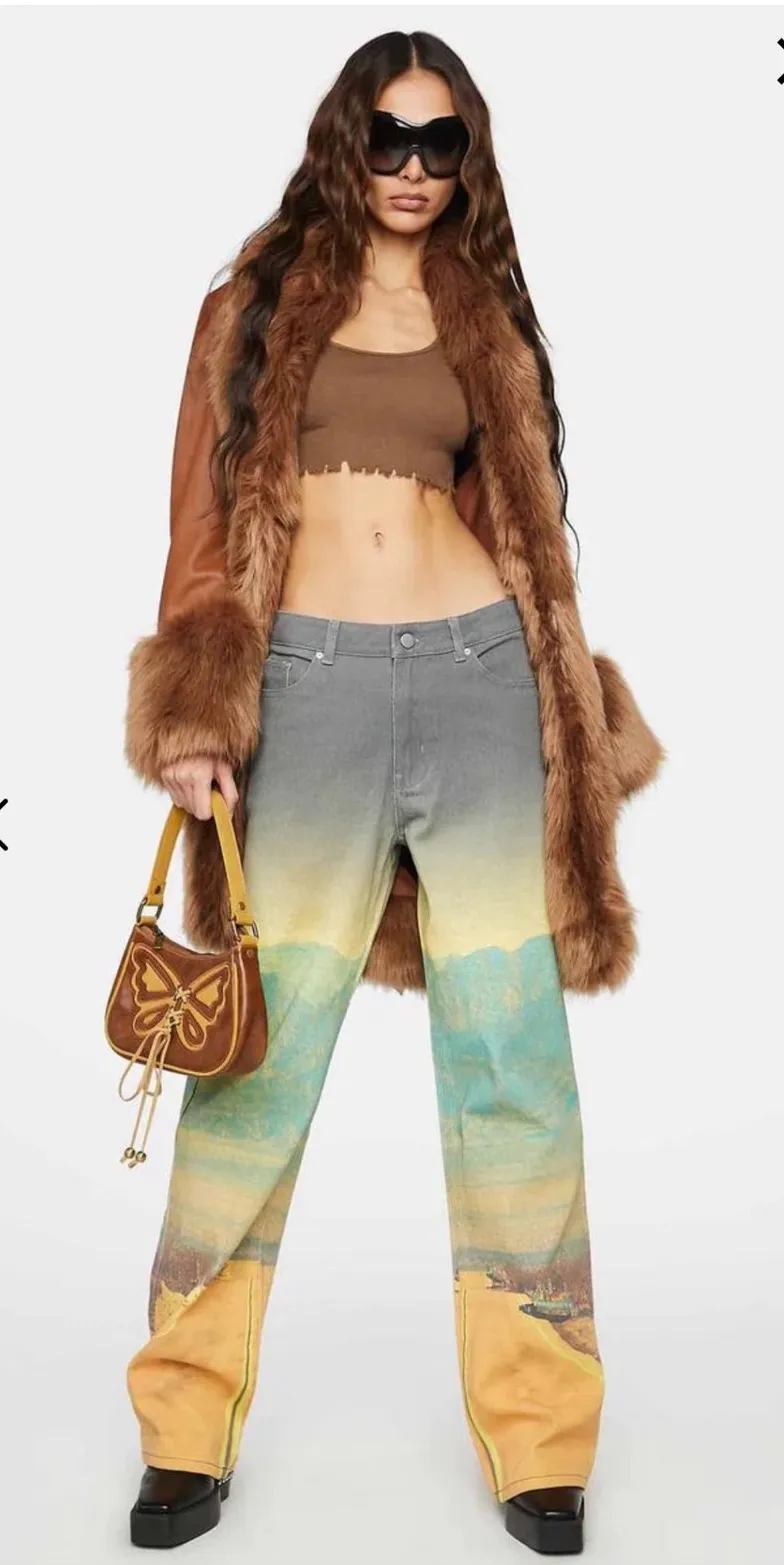 Eye-catching statement denim for the fashion-forward individual. These "The Kript" jeans showcase a unique landscape graphic print that blends a serene mountain vista with a desert highway scene. The design features a gradient effect, transitioning from a gray wash denim at the waist to vibrant yellows and blues on the lower legs. This five-pocket design offers a modern, streetwear-inspired silhouette that's both comfortable and edgy. Perfect for making a bold statement at music festivals, urban outings, or casual meetups with friends. Style: Straight Color: Gray Department: Women Type: Jeans Fabric Wash: Light Accents: Button Features: Graphic Print, Five-Pocket Design, Streetwear, Landscape Print, Gradient Pattern: Geometric Fabric Type: Denim Material: Cotton, 100% Cotton Closure: Button Keywords: The Kript, Landscape Jeans, Graphic Print Jeans, Gray Wash Denim, Streetwear Pants, Statement Jeans, Designer Jeans, Unique Denim, Fashion Jeans, Contemporary Style, Womens Jeans, Casual Pants, Scenic Jeans