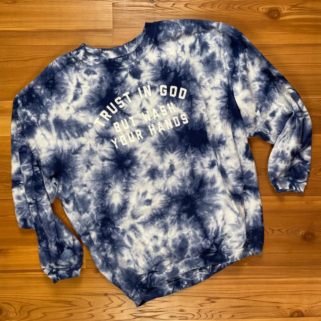 Brand New | Boutique Stock Size: XL Fit: Relaxed, some stretch Approx Measurements: 52” bust, 29” length Fabric: 100% cotton The Light Blonde luxury corded, ribbed crewneck! This crewneck sweatshirt is amazingly soft and wonderful! Relaxed fit features ribbed crew neckline, cuffs and apron hemline Blue tie dye with white lettering on front: “Trust in God But Wash Your Hands” Natural Fibers Sustainable 119