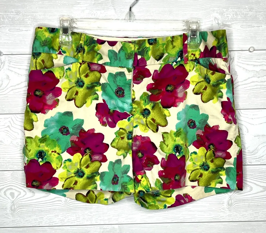 The Limited "Drew Fit" tailored high rise shorts. They feature a vibrant multicolored pattern of wat... Show more