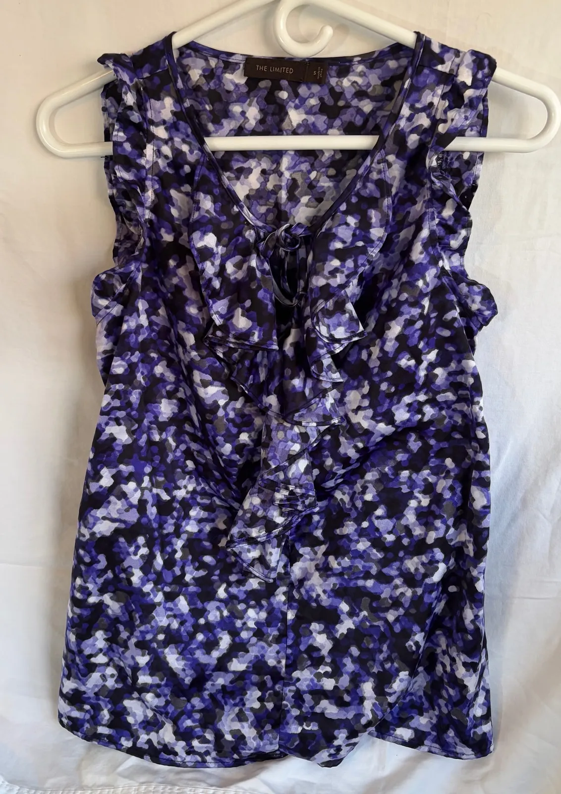 The limited purple synthetic silk sleeveless top. Tie front. Ruffle collar. Size S. Machine washab... Show more