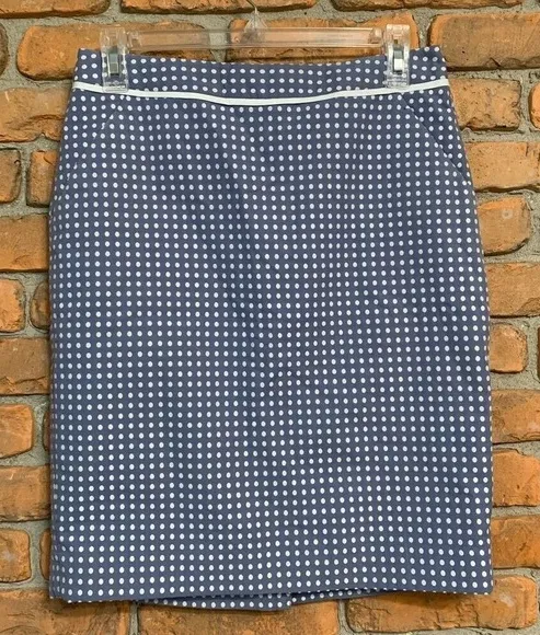 Classic pencil skirt in a blue and white polka dot pattern, perfect for professional or casual wear.... Show more