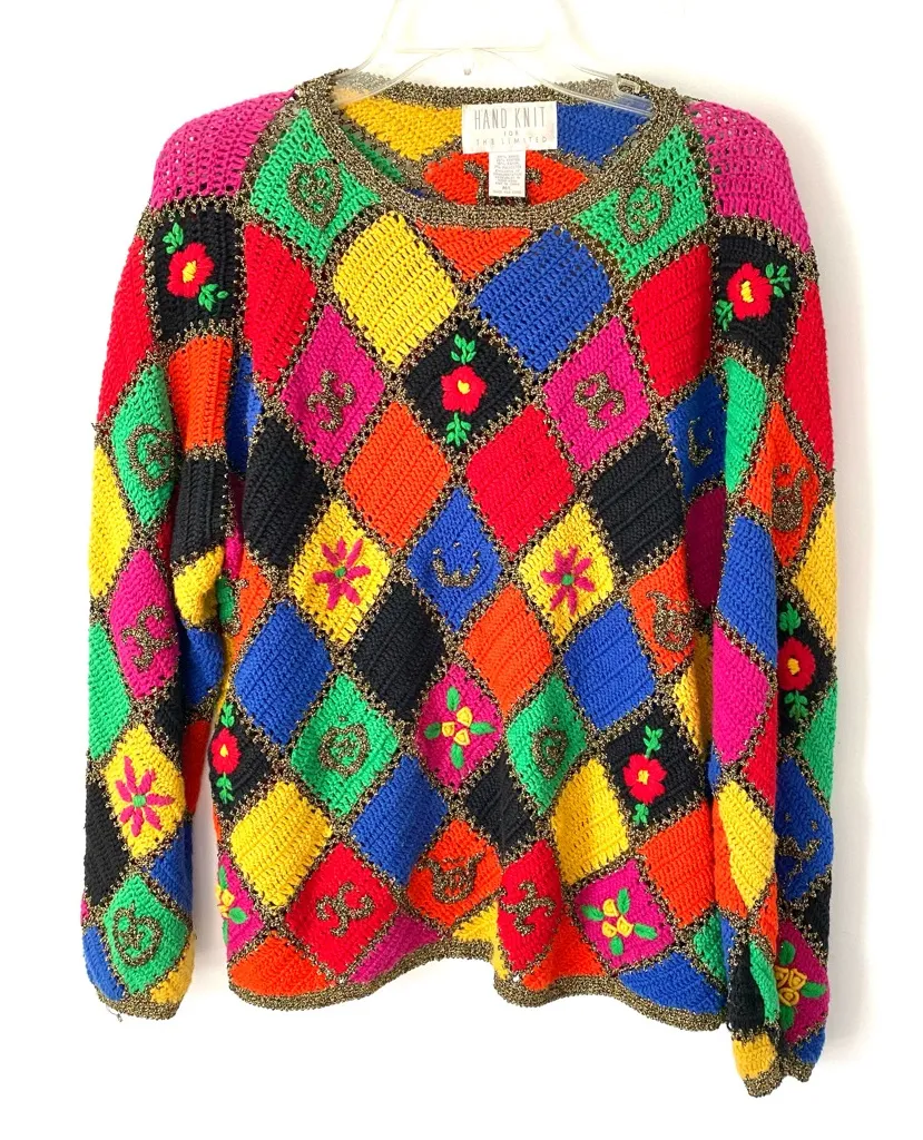 Vintage Hand Knit Limited Express Crochet Patchwork Gold Metallic Sweater M/L with embroidery in exc... Show more