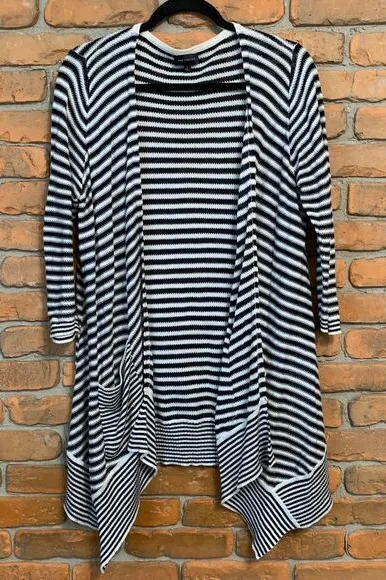 Stylish striped open front cardigan from The Limited featuring a dramatic asymmetrical hem. Made wit... Show more