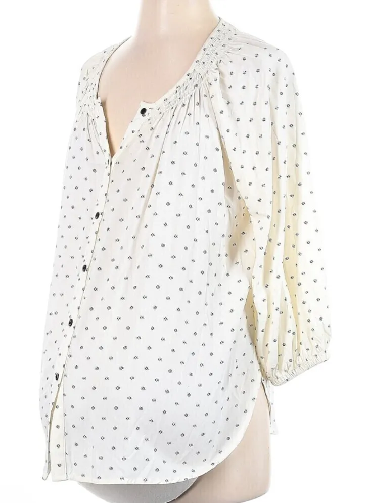 3/4 sleeve, plunge, star print, polka dot print, grommet, drawstring, studded detail, ivory Brand: The Nines By Hatch Department: Women's Size: Large Lightweight Color: White and Black Style: Blouse Fit: Relaxed Neckline: Crew Neck Closure: Buttons Sleeve Type: Balloon Sleeve Sleeve Length: 3/4 Sleeve Material: 100% Rayon Pattern: Spotted Condition: Excellent Pre-Owned Condition