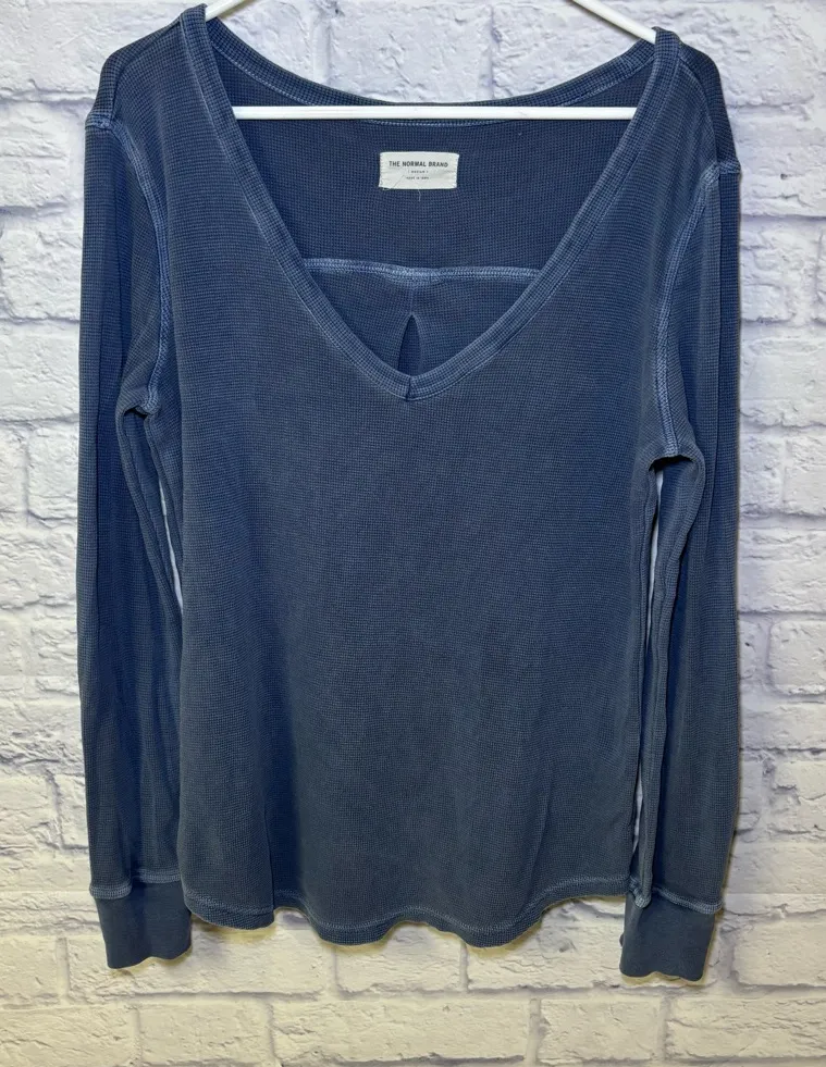 The Normal Brand Long Sleeve Thermal shirt in size Medium is a stylish and comfortable option for everyday wear. Featuring a classic blue color, solid pattern, and V-neck design, this pullover top is perfect for casual outings, workwear, or even travel. Made from a cozy cotton blend material, this thermal shirt is a versatile piece that can be worn throughout all seasons. With its timeless design and machine washable care instructions, this shirt is a practical and stylish addition to any woman's wardrobe. In great condition Underarm to underarm 20.5 Length 26 W146