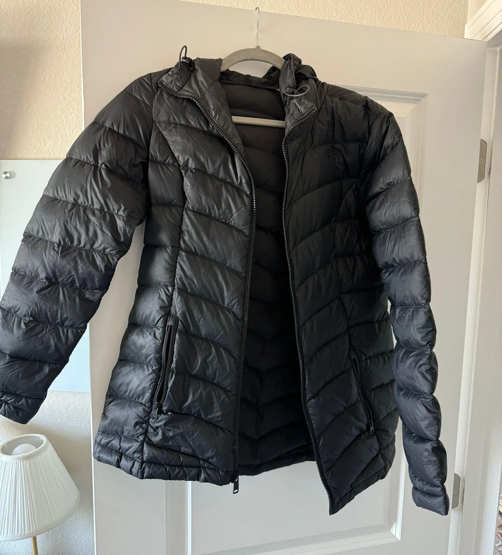 Black puffer jacket with hood, in excellent condition! Oversized, can fit over a sweatshirt