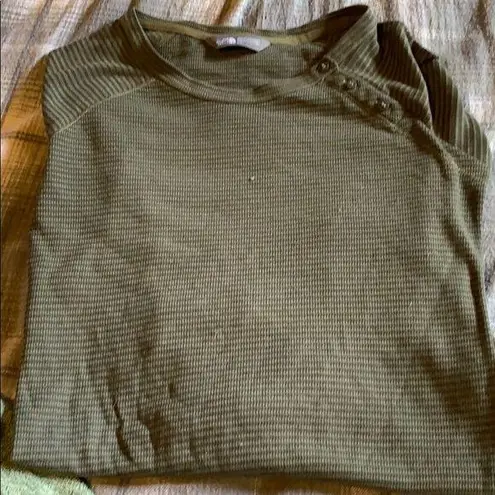 Green long sleeve north face shirt. Texture feels like the waffled pajamas. Too small for my shoulde... Show more
