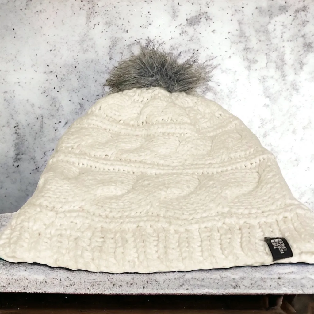Northface Womans White Cable Thick Knit Pom Pom Beanie Hat One Size Excellent Pre Owned Condition... Show more