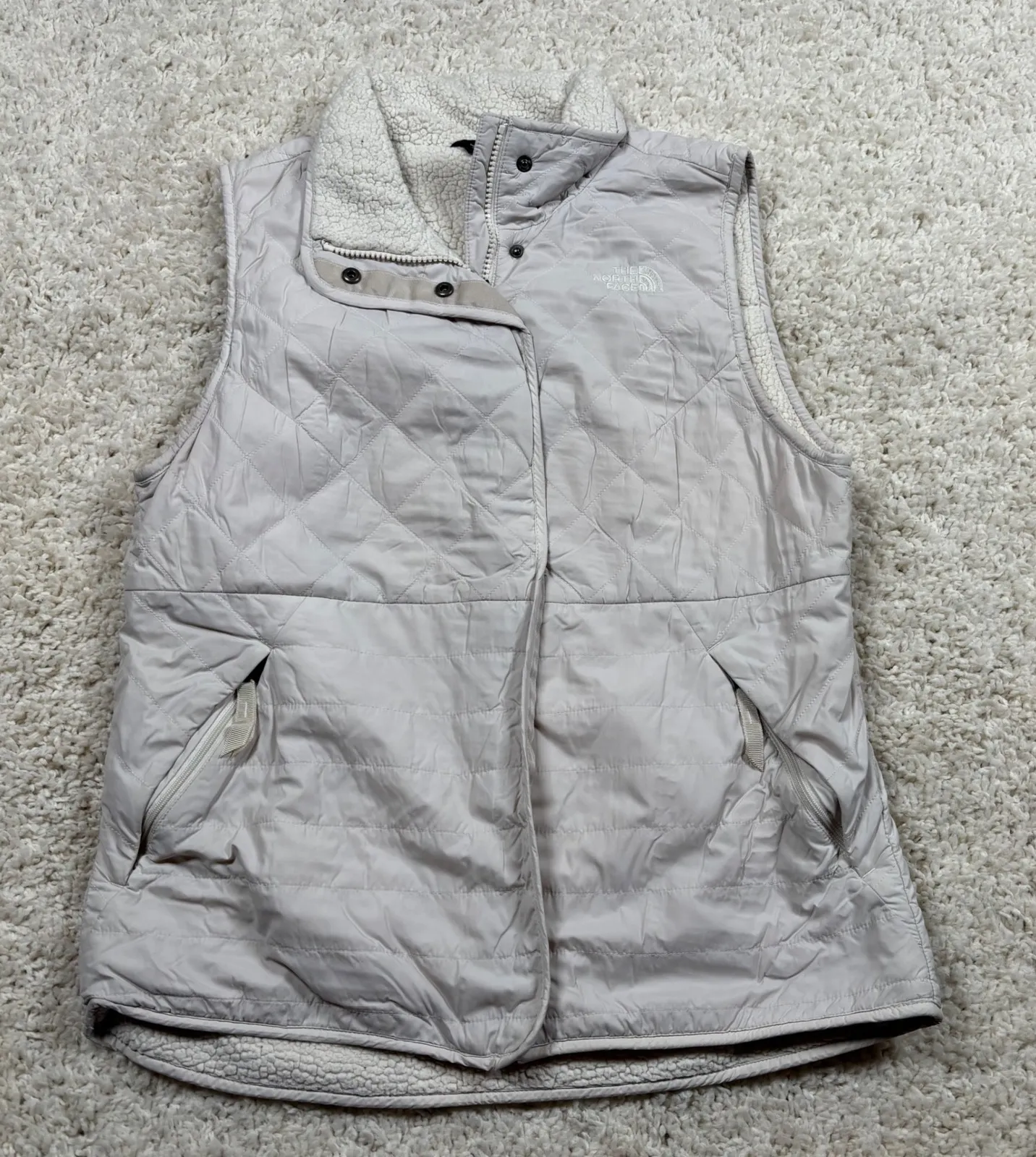 Keywords: The North Face, quilted vest, sherpa lined, snap front, women's vest, outdoor apparel, casual wear, layering piece, fall fashion, winter warmth, travel gear, activewear