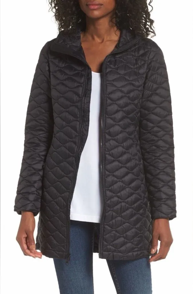 Sleek black puffer for warmth and style. Lightweight and cozy. Ideal for chilly days. Length approx... Show more