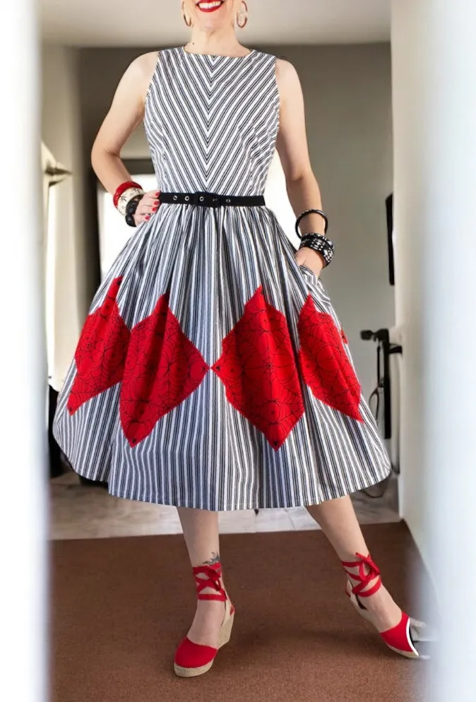 Brand New, No Tags (BNWOT) Step out in striking vintage style with this gorgeous full-skirt dress from The Oblong Box Shop by Denielle Von Fitch. This dress is perfect for rockabilly events, pinup looks, or anyone who loves mid-century fashion with a bold twist. Features: • Design:Classic fit-and-flare Silhouette with a stunning full skirt. • Pattern: Eye-catching gray and white vertical stripes on the skirt (and a chevron pattern on the bodice) contrasted with bold red diamond/harlequin accents. • Detail: Defined waist, includes a black belt (as shown on the mannequin). • Fabric: Made from comfortable, breathable 100% Cotton. • Size: XL (Please refer to the brand's size chart for a perfect fit). & Care Instructions: Machine Wash Cold, Tumble Dry Low, Hang Dry, Iron on low heat. •Measurements Length 40” Bust 21” Waist 18” •Side Pockets #TheOblongBoxShop #DenielleVonFitch #PinupDress #Rockabilly #VintageStyle #FullSkirt #Harlequin #StripeDress #CottonDress #Gothabilly #Psychobilly #SwingDress #50sStyle #XL