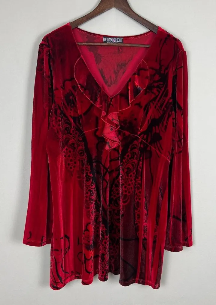 The Pyramid Collection Tunic Top Womens XL Red Velvet Ruffle Floral Long Sleeve Very good condition! Measurements are in the photos. Pullover Red and black V-neck Stretch Fabric content and washing / care information in photos - see tag photos. All preowned items have been cleaned. Stored in a smoke and pet free home. Thanks for looking!
