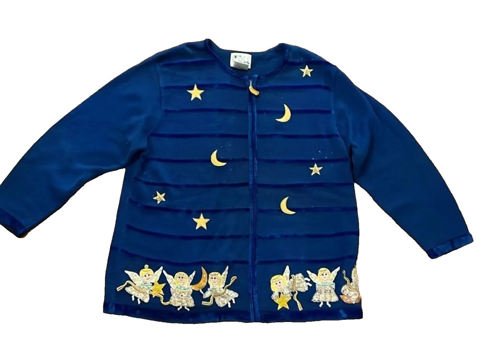 Vintage, blue, 53% ramie, 35% cotton, 8% rayon, 4% acrylic, full zip, long sleeves, mixed media, angel, stars and moon themed, cardigan sweater by The Quacker Factory in a women's size 1X. Crescent moon pull tab covered in sequins. The angels also have sequins as well as beads and metallic thread. Hand washable. Approximate measurements shown in photos. In great pre-owned condition. angels, beads, sequins, christmas, holiday, embroidered, vintage, VTG