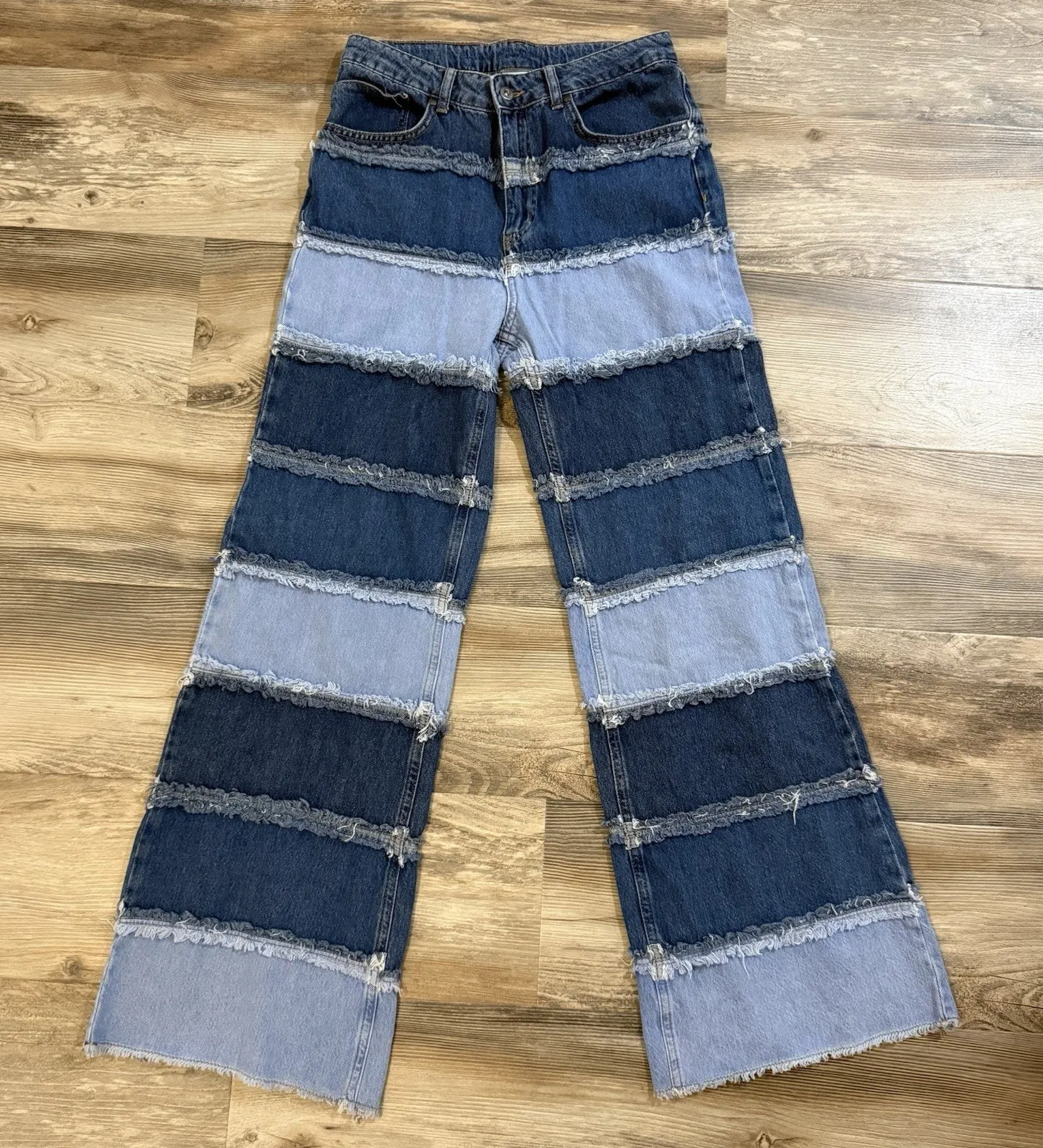 Standout and edgy — these Ragged Priest wide-leg jeans feature a bold two-tone patchwork design with raw frayed seams and a structured 100% cotton denim feel. High-rise fit with a vintage-inspired aesthetic and raw hem. A true statement pair. Details: • Brand: Ragged Jeans (The Ragged Priest) • Size: Women’s 28 • Color: Blue / Two-Tone Denim • Style: Patchwork Wide-Leg Jeans • Rise: High Rise • Material: 100% Cotton • Made in Turkey • Closure: Button & zip • Features: Raw hem, distressed seam detailing Approx. Measurements (laid flat): • Waist: 14.5” • Rise: 12” • Inseam: 31” • Leg Opening: 11.5” Condition: Excellent pre-owned condition. Most items I sell are thrifted or secondhand and may have a light laundry detergent scent. All items come from a smoke-free, pet-friendly home. Feel free to make offers or ask questions!