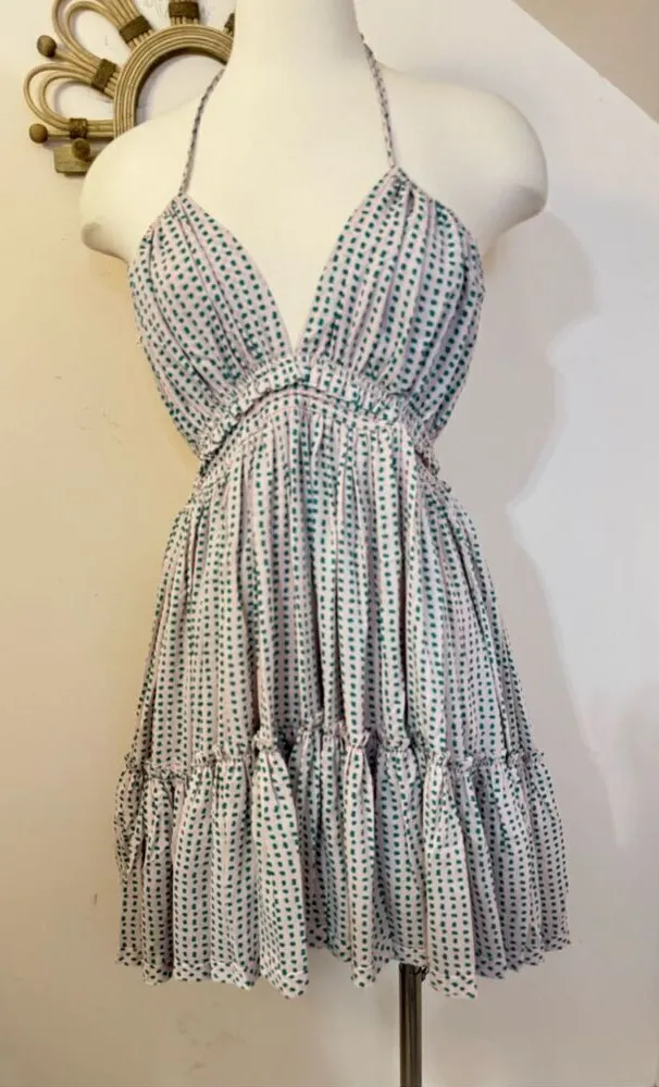Flirty mini dress from The Reset By Jane Baby pink with little green brush stroke squares Plunging neckline Dramatic ruffle hemline Multiple tie straps at neck and back Adjustable drawstring tie at waist Tagged small, but would definitely fit medium, flexible due to ties Brand new Sweet Flirty Ruffle Feminine Coquette Party Date Romantic