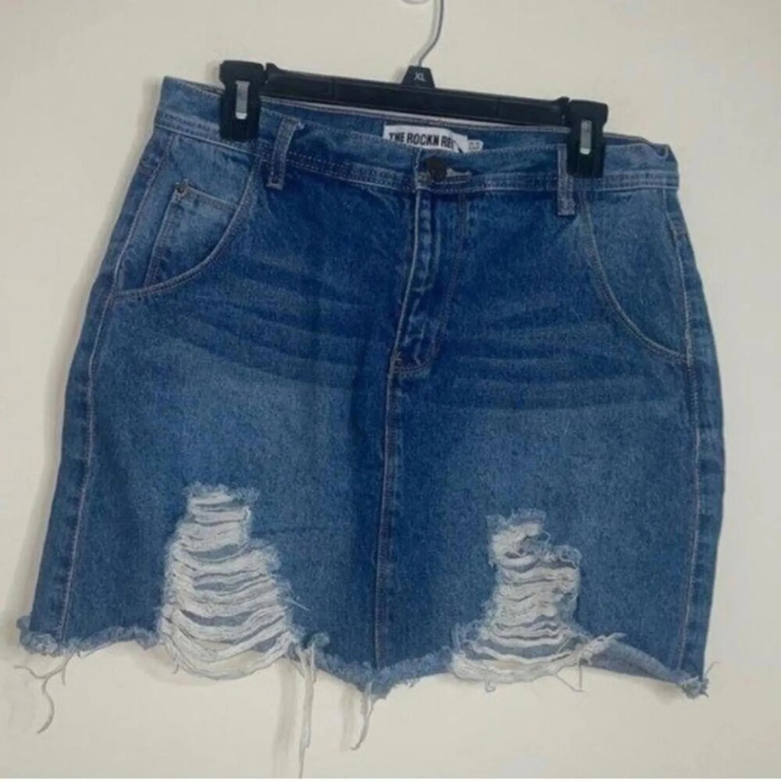 The Rockin Rev brand. Color: blue Blue 100% cotton distressed denim skirt. It has 2 pockets and 1 small pocket. It closes with a button and zipper closure and has belt loops. It has triangular distressing on the front bottom. MEASUREMENTS: Waist: 15.5 inches Waist to bottom hem: 15 inches