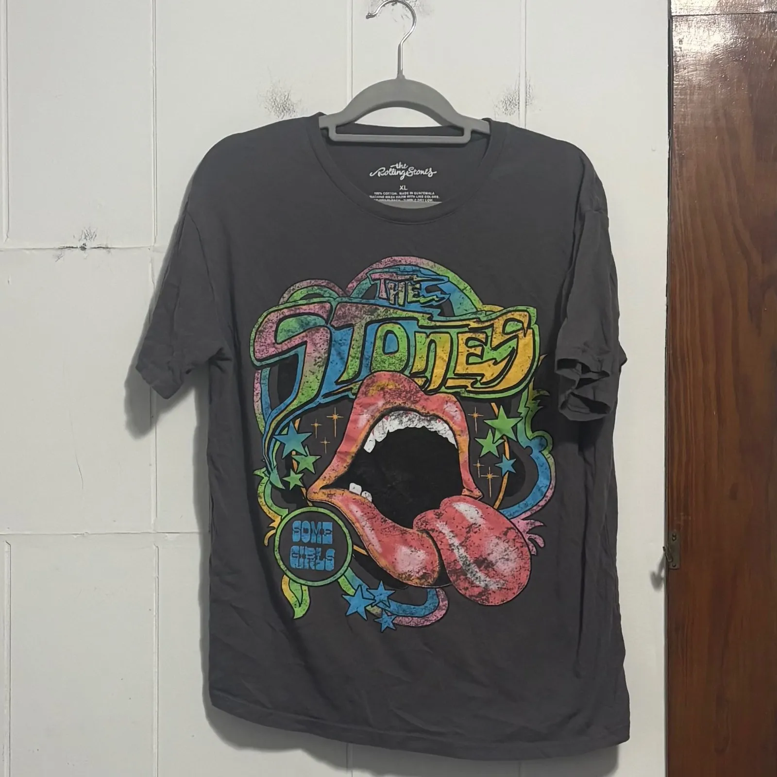 The Rolling Stones graphic t-shirt XL charcoal. Features the iconic lips and tongue logo with colorful "The Stones" text and "Some Girls" detail. Perfect for concerts, casual wear, or showing off your rock and roll spirit. Type: T-Shirt Department: Unisex Adults Style: Basic Material: Cotton Neckline: Crew Neck Sleeve Length: Short Sleeve Sleeve Type: Casual Sleeve Pattern: Solid Accents: Glitter Theme: Classic, Stars Features: Stretch Fit: Regular Fabric Type: Jersey Occasion: Casual Closure: Pullover Season: Spring, Summer, Fall Keywords: band tee, concert shirt, rock and roll, graphic tee, vintage inspired, music apparel, casual top, summer concert, tour shirt, iconic logo