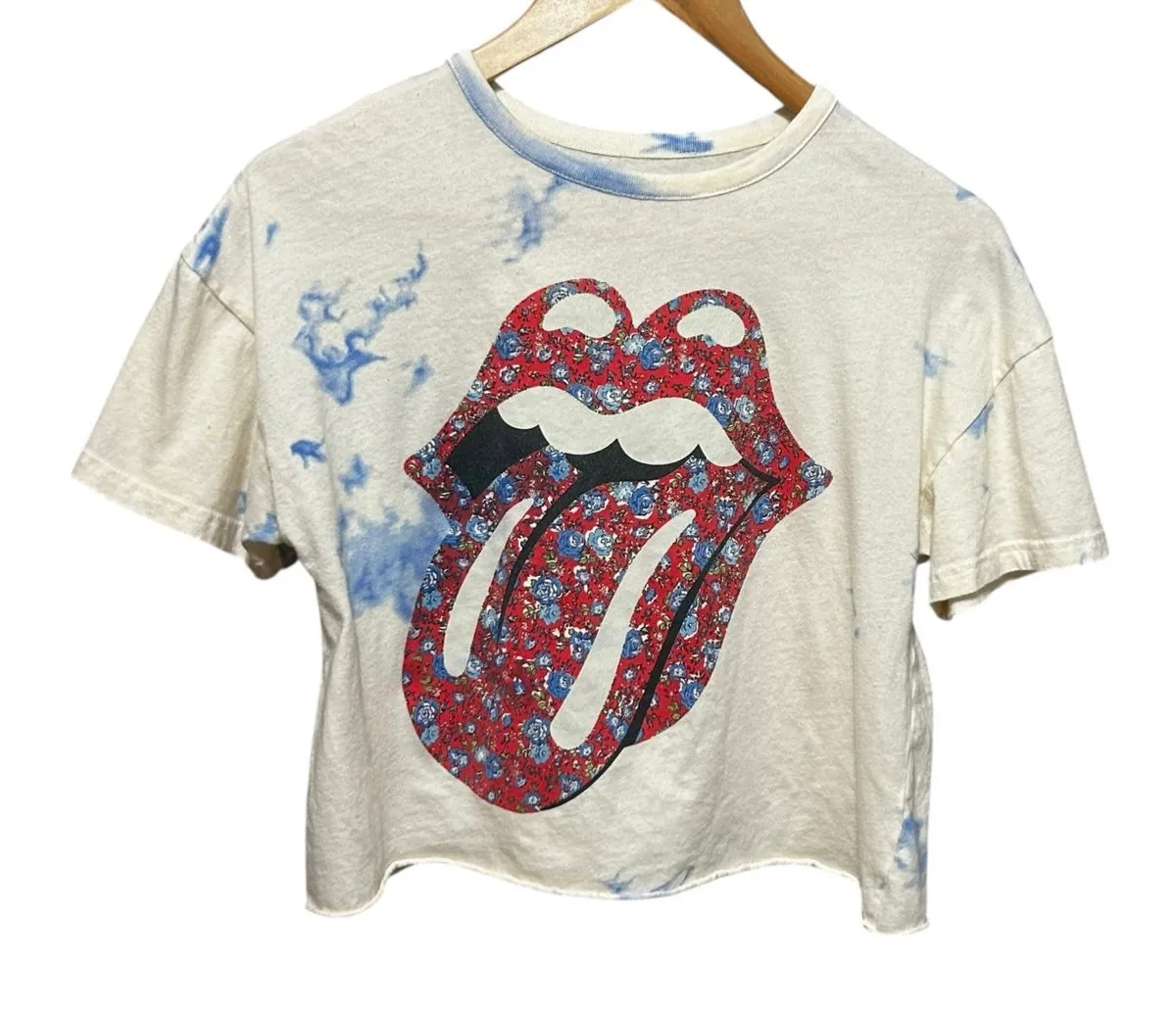 Great Pre-Owned Condition - See Pictures for Details Details: (First picture truest color) • Official Rolling Stones licensed merchandise • Iconic tongue graphic with floral print • Blue tie dye accents on soft white cotton • Cropped relaxed fit for modern streetwear vibe • Perfect for concerts, festivals, or casual weekend wear • 100% cotton, machine wash Style Profile: graphic tee, crop top, tie dye, band merch, concert style, retro, grunge, retro, casual, relaxed fit, rock aesthetic, pair with high-waisted jeans and boots for a vintage rock concert look Approximate Measurements: flat lay: armpit to armpit: 19" length: 18" Pet/ smoke free home 1-2 day shipping Bundle & Save