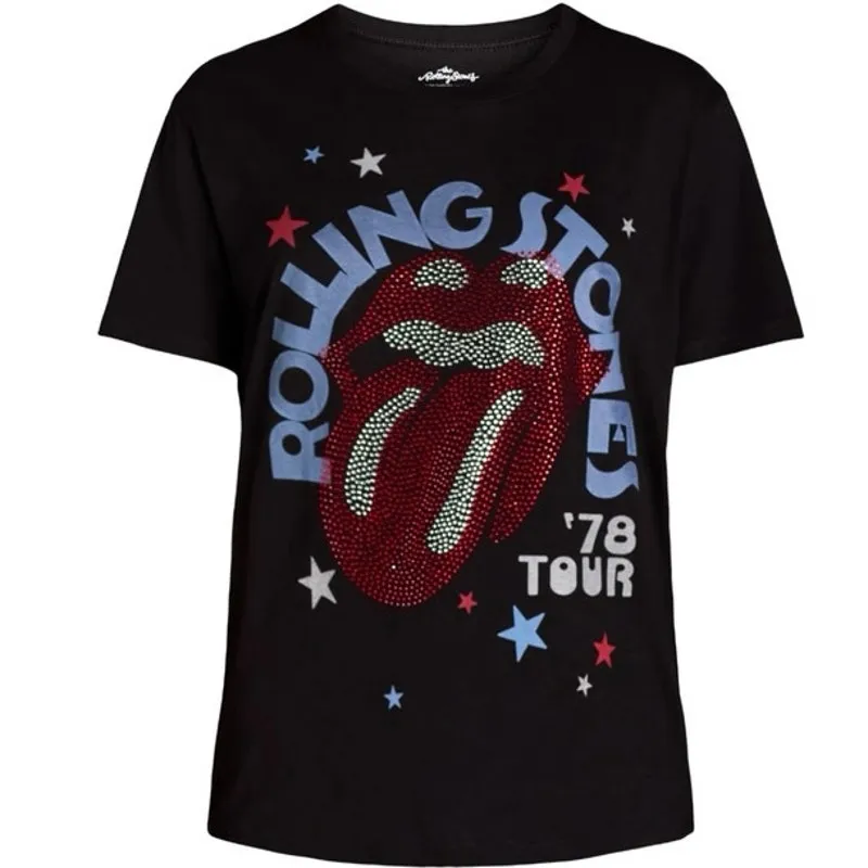 Women’s Rolling Stones Rhinestone Stud Graphic Band Tee Size XXL 2X It’s just a graphic tee, but I like it! Rock on and let your inner fangirl shine with this Rolling Stones Graphic Tee shimmering with an iconic rhinestone stud logo. Cool, comfy and totally relaxed, this tee features a vintage-vibe for a total retro look, short sleeves and a looser fit.