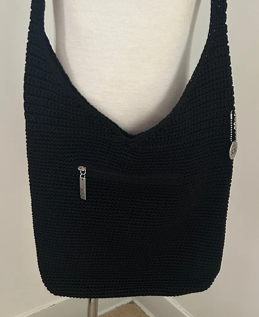 Stylish and versatile black crochet Y2K shoulder bag. Sturdy design with reinforced bottom and long strap. One zipped outer pocket and one zipped inner pocket. Snap at top to secure contents. Great condition!