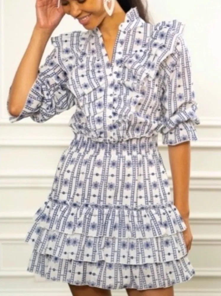 The Shirt Rochelle Behrens Smocked Ruffle Shirt Mini Dress Size X- Small 100% White Cotton with Navy Blue Floral Embroidery New with tags 17.25” pit to pit 13.5” waist 34.5” length (21)